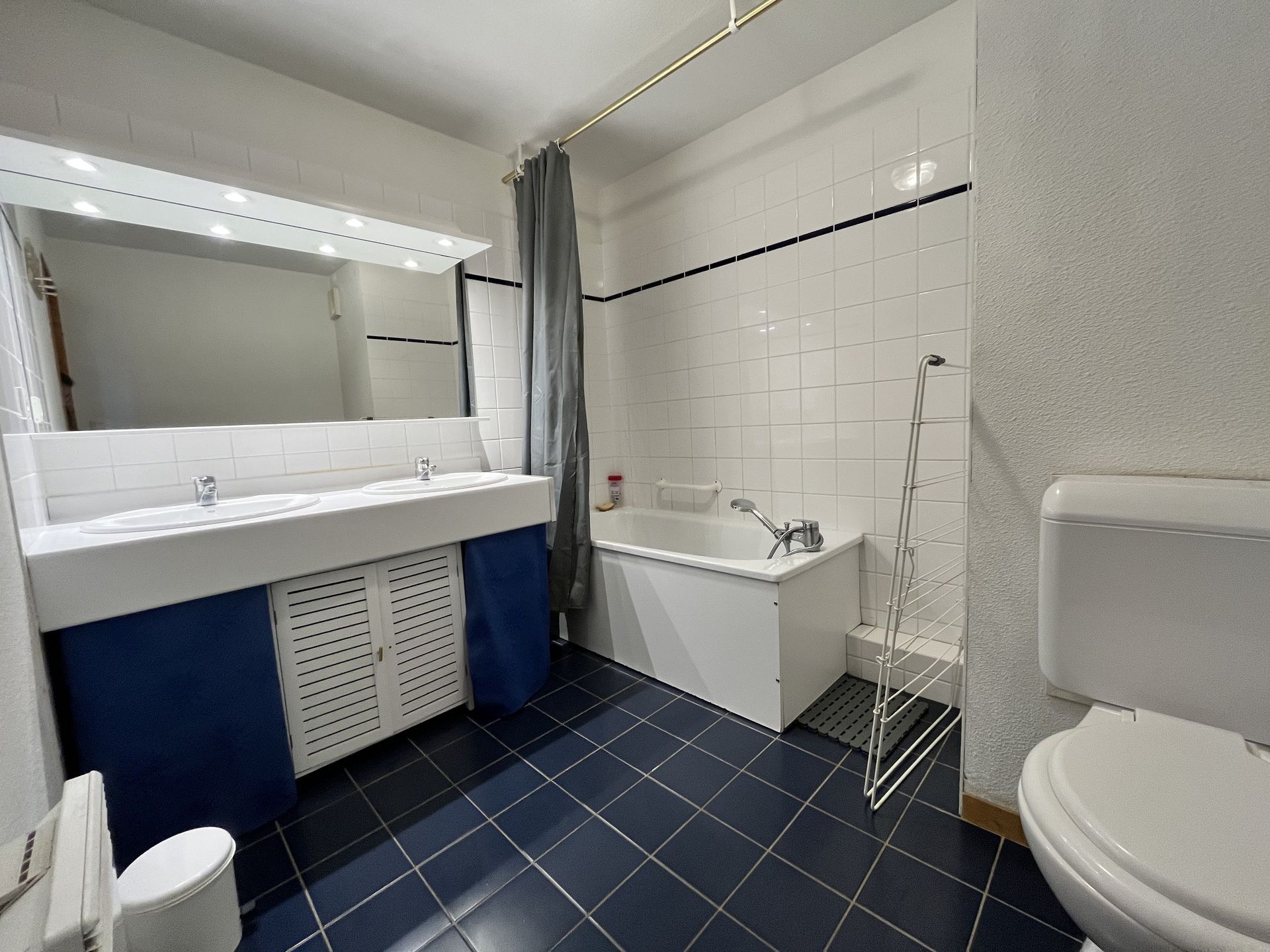 Une salle de bain avec double vasque et WC