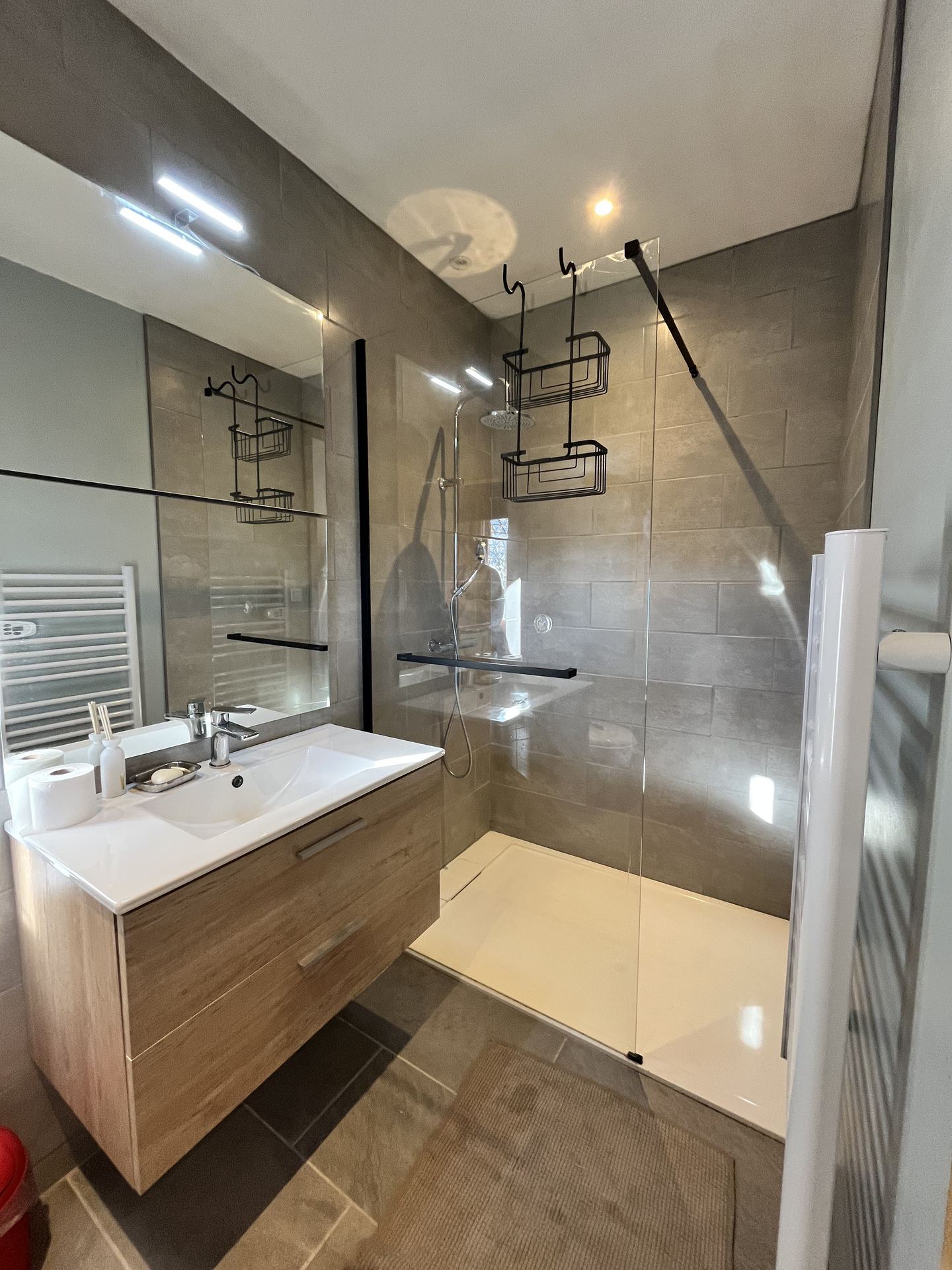Cuisine entièrement équipée (frigo/congélateur, four, micro-ondes, lave-vaisselle, cafetière à dosette "Nespresso", grille pain et bouilloire).