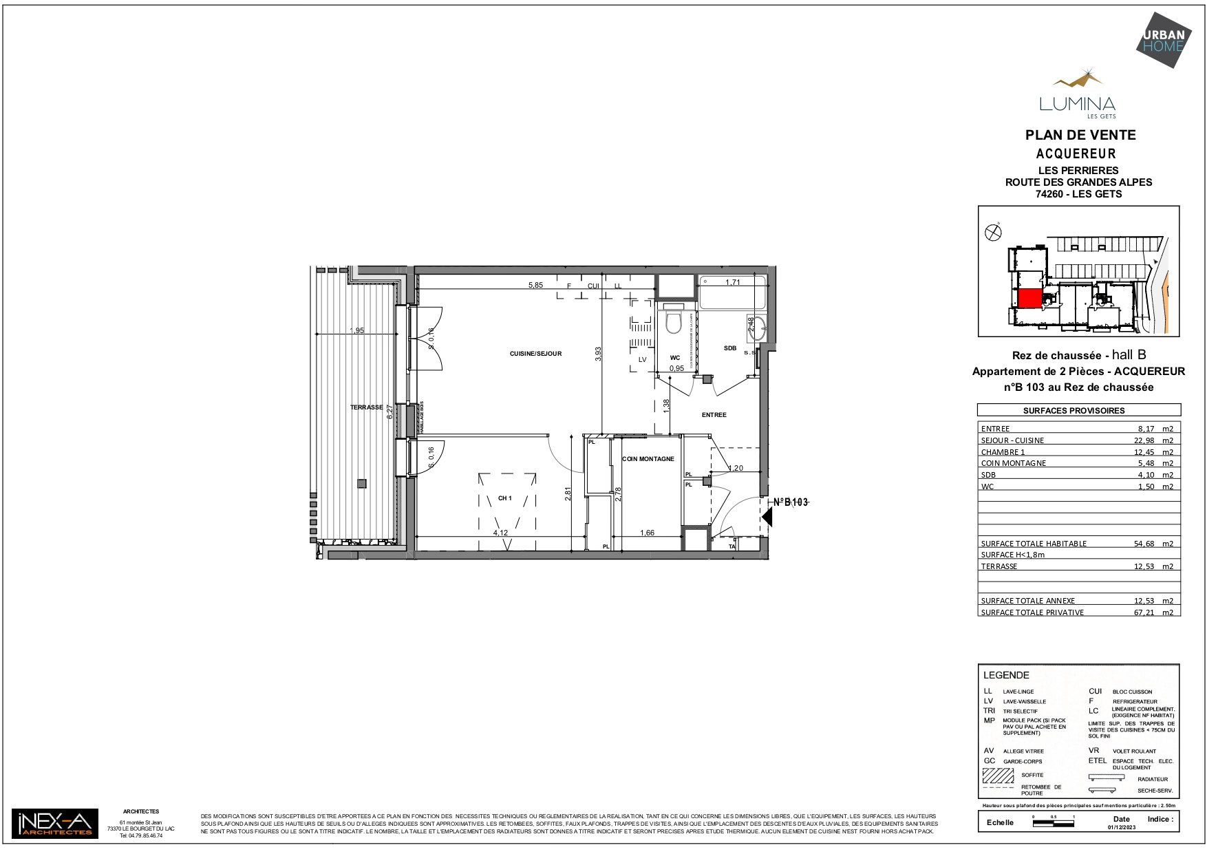 Découvrez notre nouvelle résidence « Lumina » aux Gets. Appartement B103 - 1 chambre / 54.68 m2