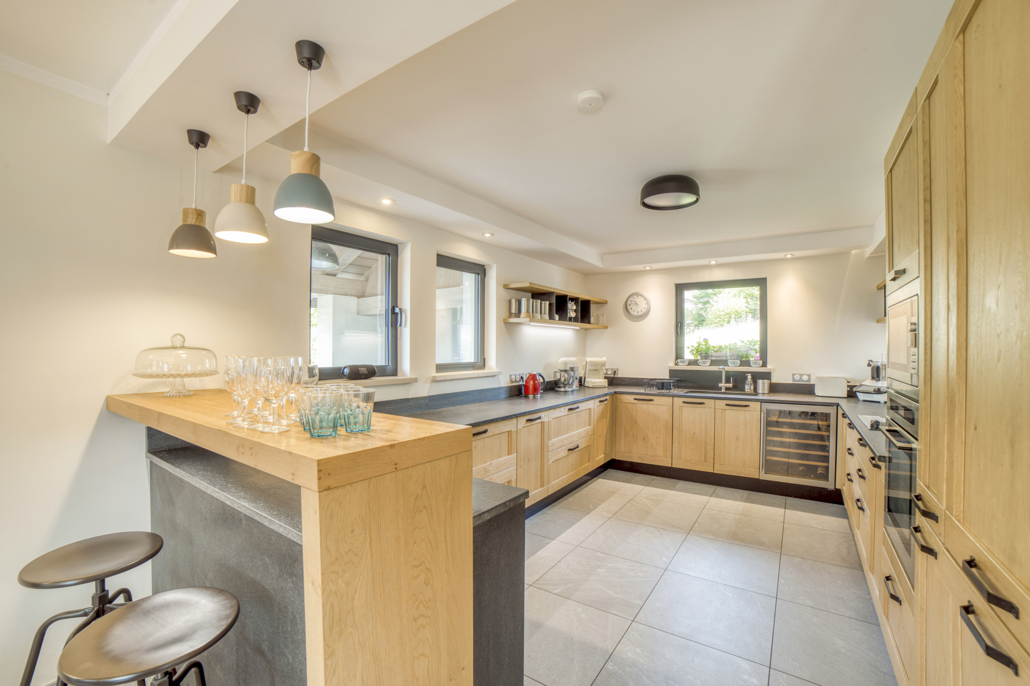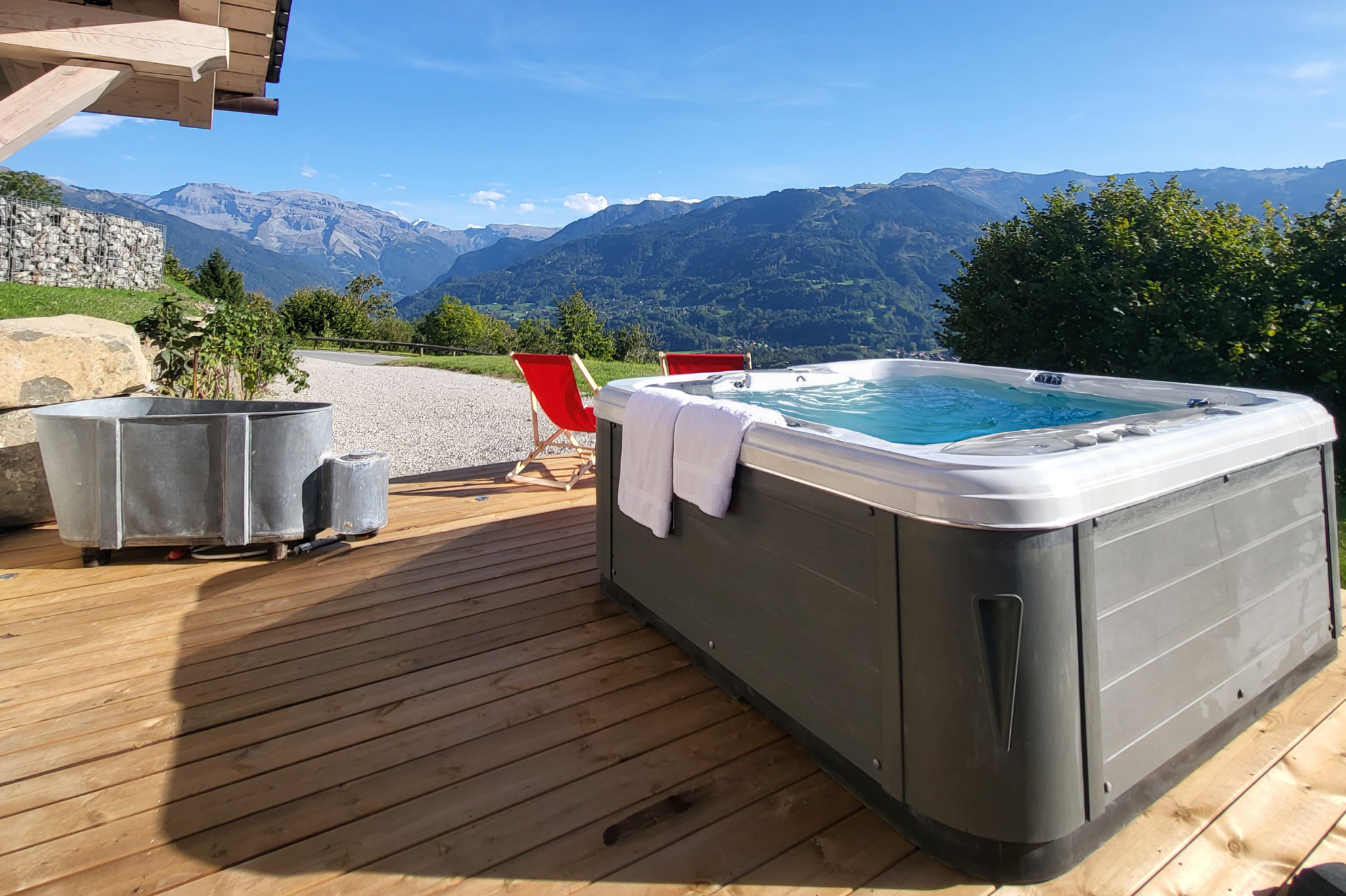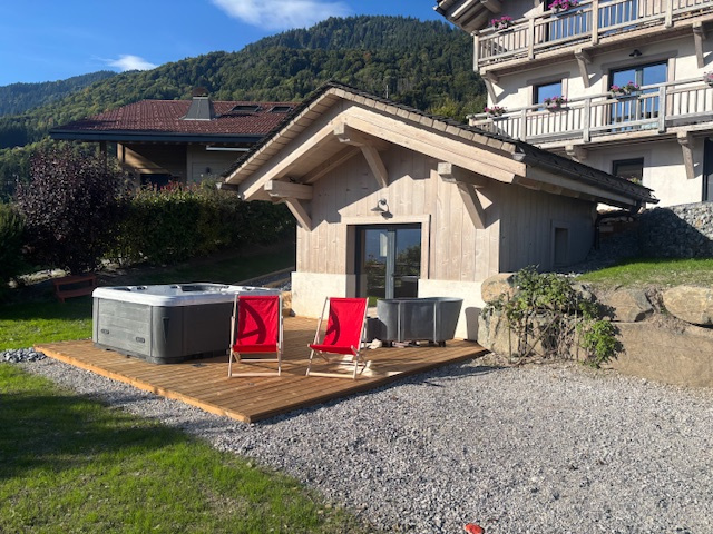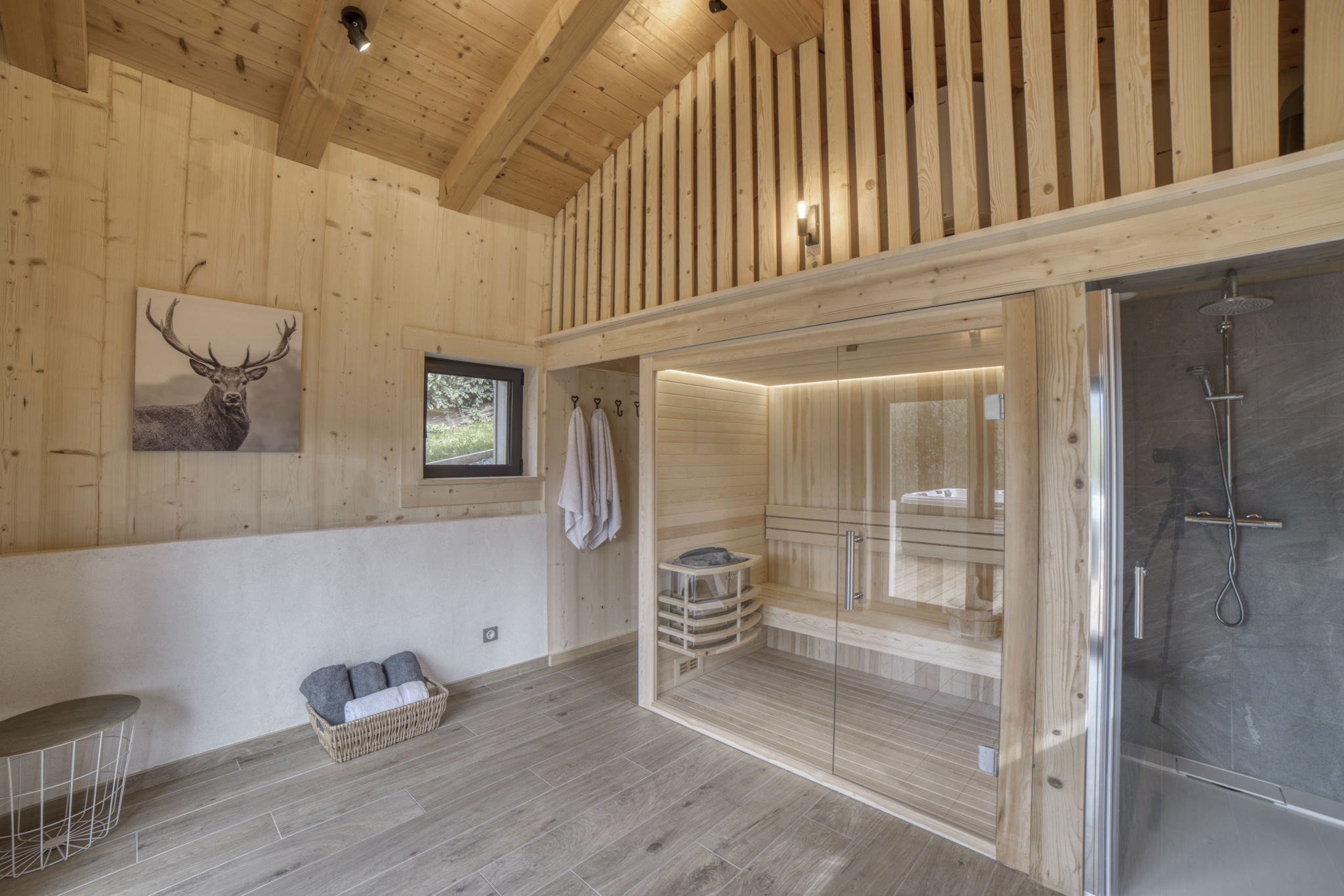 Bien évidemment, les espaces extérieurs n'ont pas été oubliés ! Une cuisine d'été abritée vous attend pour profiter de moments agréables et festifs, ainsi qu'un espace bien-être avec jacuzzi extérieur et sauna / douche au sein d'un petit chalet annexe.